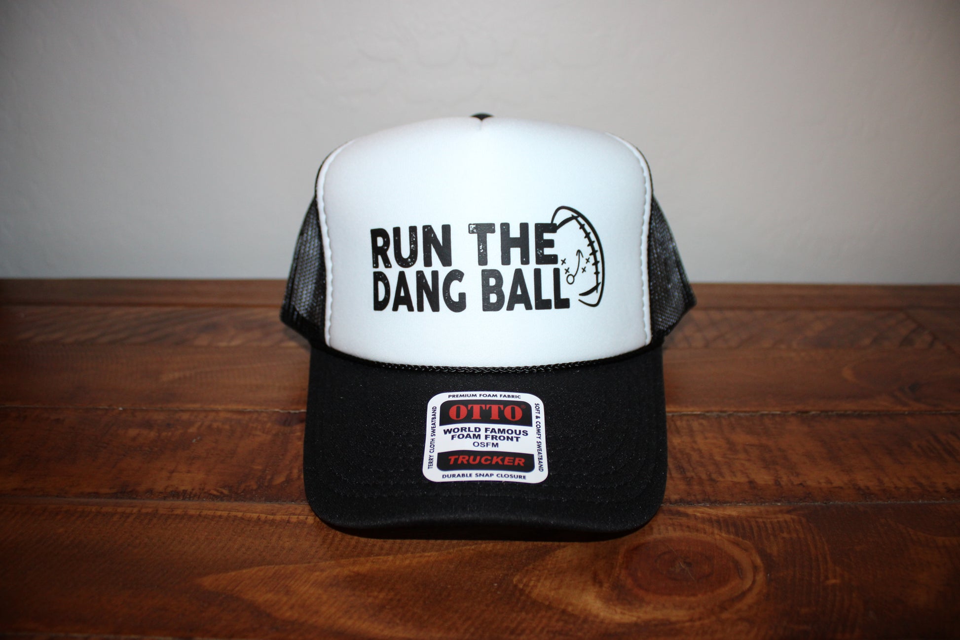 White and black OTTO brand A-frame foam cap with DTF imprinted design.
